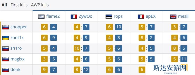 首杀对位上,ZywOo为队伍贡献7次首杀,flameZ贡献6次。而Spirit一方最多的是sh1ro和donk,均为7个。