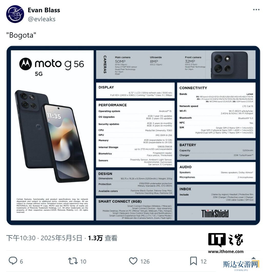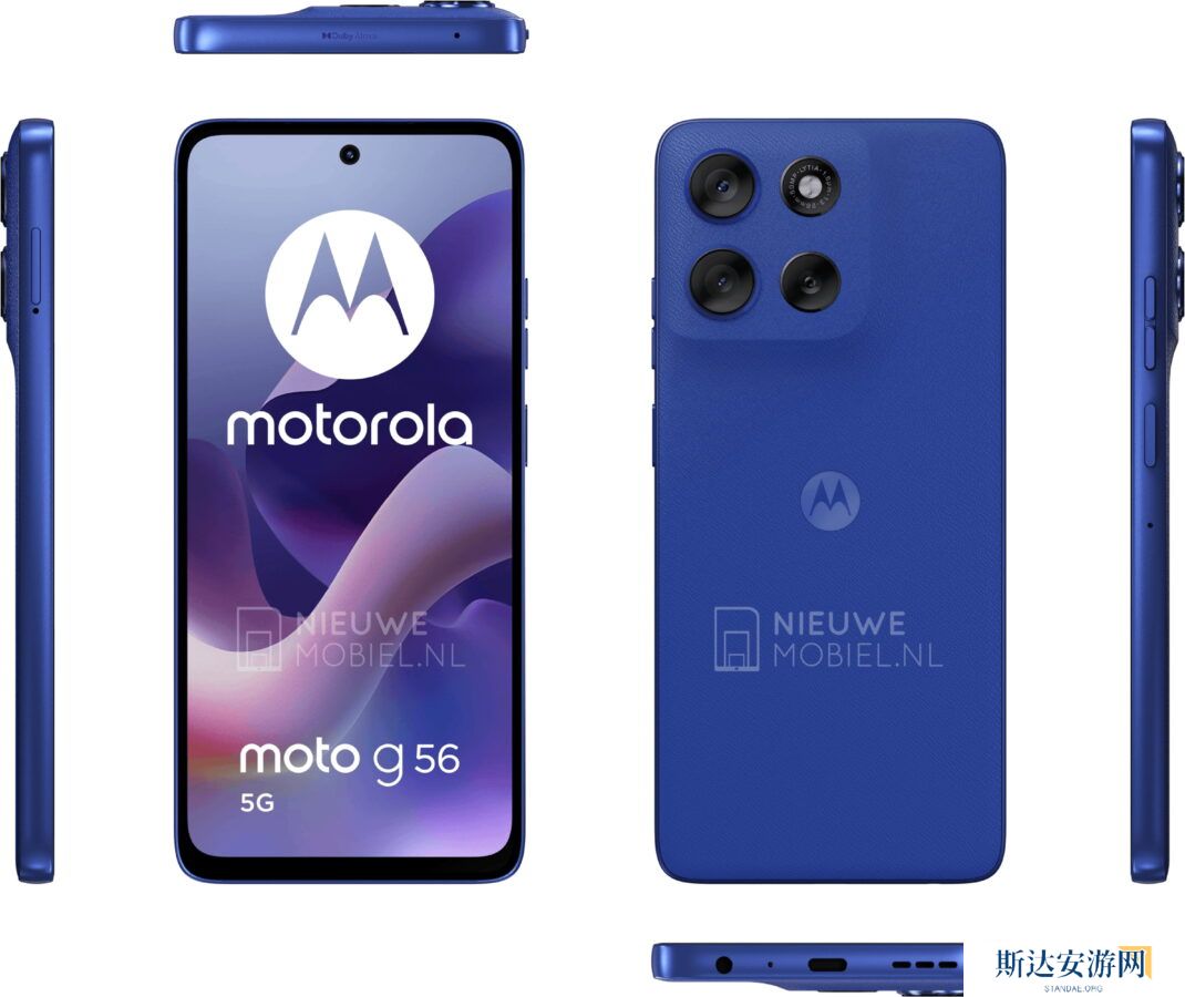 本站 5 月 16 日消息,科技媒体 nieuwemobiel 昨日(5 月 15 日)发布博文,再次分享了摩托罗拉 Moto G56 5G 手机的高清渲染图,公开了蓝色、绿色和黑色三种颜色的全方位图片。