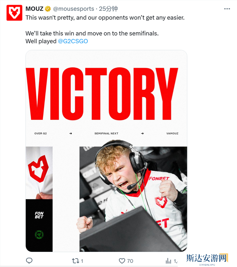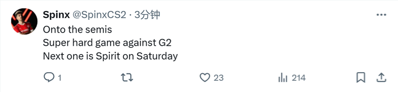 Spinx:打进半决赛,对阵G2非常艰难。接下来周六打Spirit。