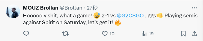 Brollan:这比赛太激烈了。2-1 G2,GG。周六半决赛打Spirit,让我们一鼓作气!