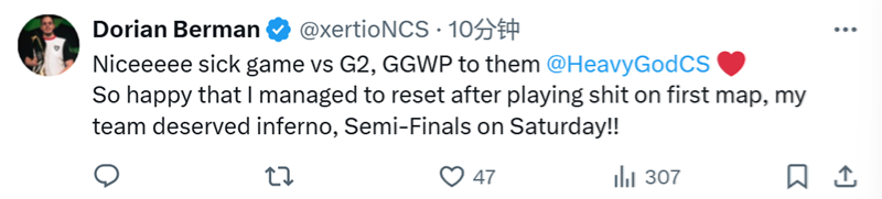 xertioN:Niceeeee,与G2的比赛很精彩,GGWP。很高兴我在第一张地图表现糟糕后成功调整状态,我的队伍本应拿下Inferno的,周六半决赛!!!