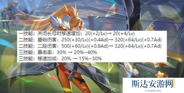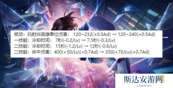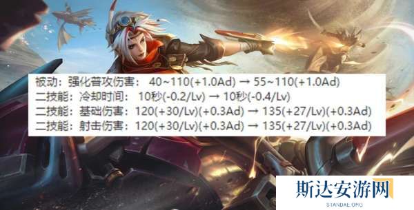 被动伤害后期提升,一技能前期冷却缩减提高后期不变,二技能前期冷却缩减降低,后期不变,二技能伤害前期降低,后期提高。这个调整就是后期伤害提高,刚好对应装备对于射手后期伤害的削弱。