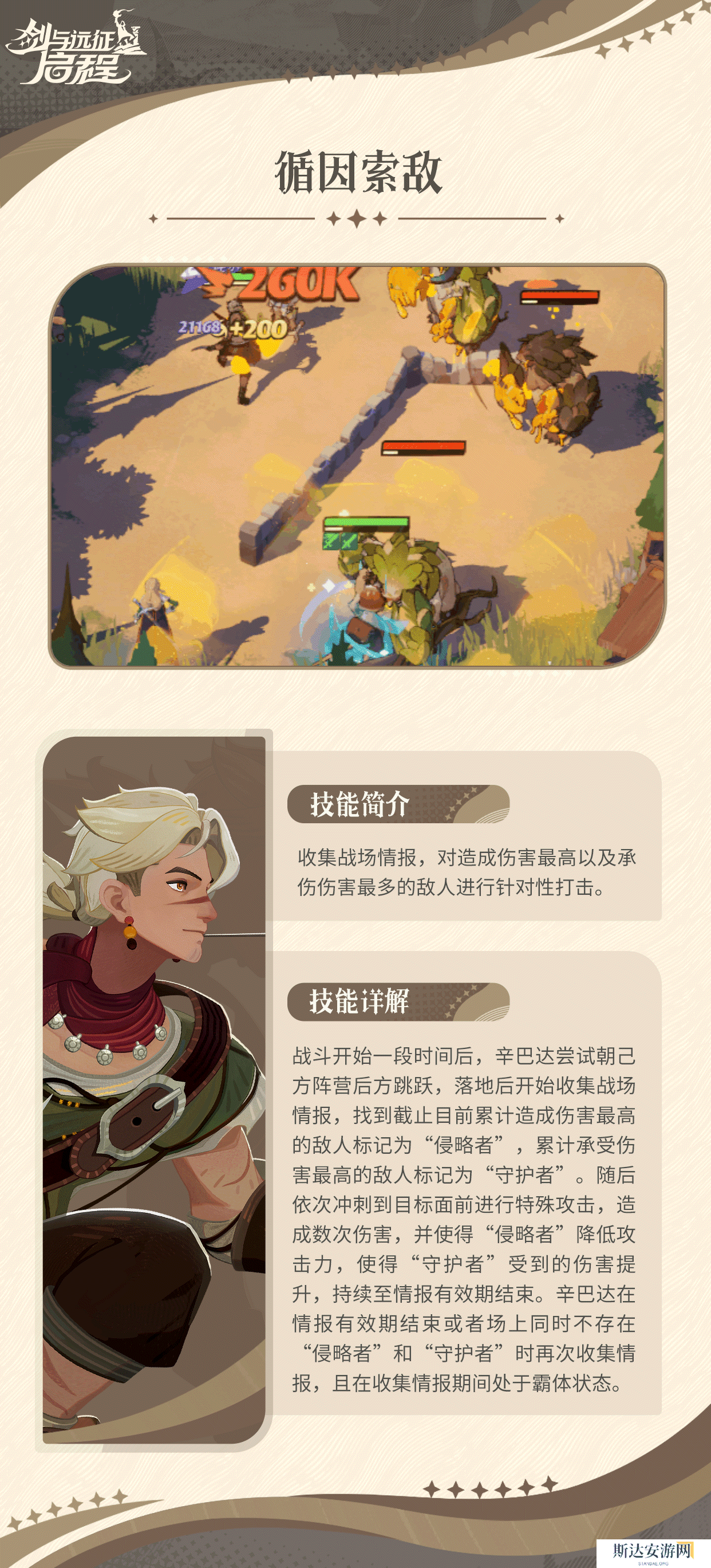 效果:战斗开始6秒后,辛巴达会跳到我方阵容后面进行情报收集。让敌方输出伤害最高的为“侵略者”,让敌方受到伤害最高的为“守护者”。对“侵略者”降低60%攻击力,对“守护者”增加40%的伤害。